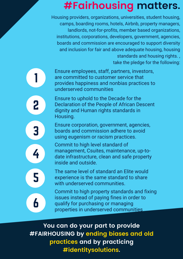 Take the pledge to end institutional and environmental racism known to plague marginalized communities. Pledge to ensure peace and happiness are the essential priorities in all communities, particularly marginalized and underserved communities. Take the pledge to support #FairHousing.