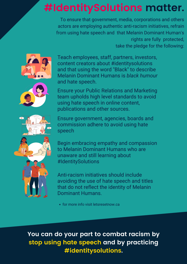 The Reset Community encourages an end to this black humour performed by public relation firms, media outlets, advertising agencies, publicists, corporations, government and institutions.. It is authentic to invest in real #identiysolutions. Help end racism and take the pledge to stop categorizing Melanin Dominant Humans as “Black. “