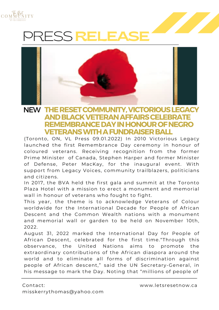 (Toronto, ON, VL Press 09.01.2022) In 2010 Victorious Legacy launched the first Remembrance Day ceremony in honour of coloured veterans. Receiving recognition from the former Prime Minister of Canada, Stephen Harper and former Minister of Defense, Peter MacKay, for the inaugural event. With support from Legacy Voices, community trailblazers, politicians and citizens.