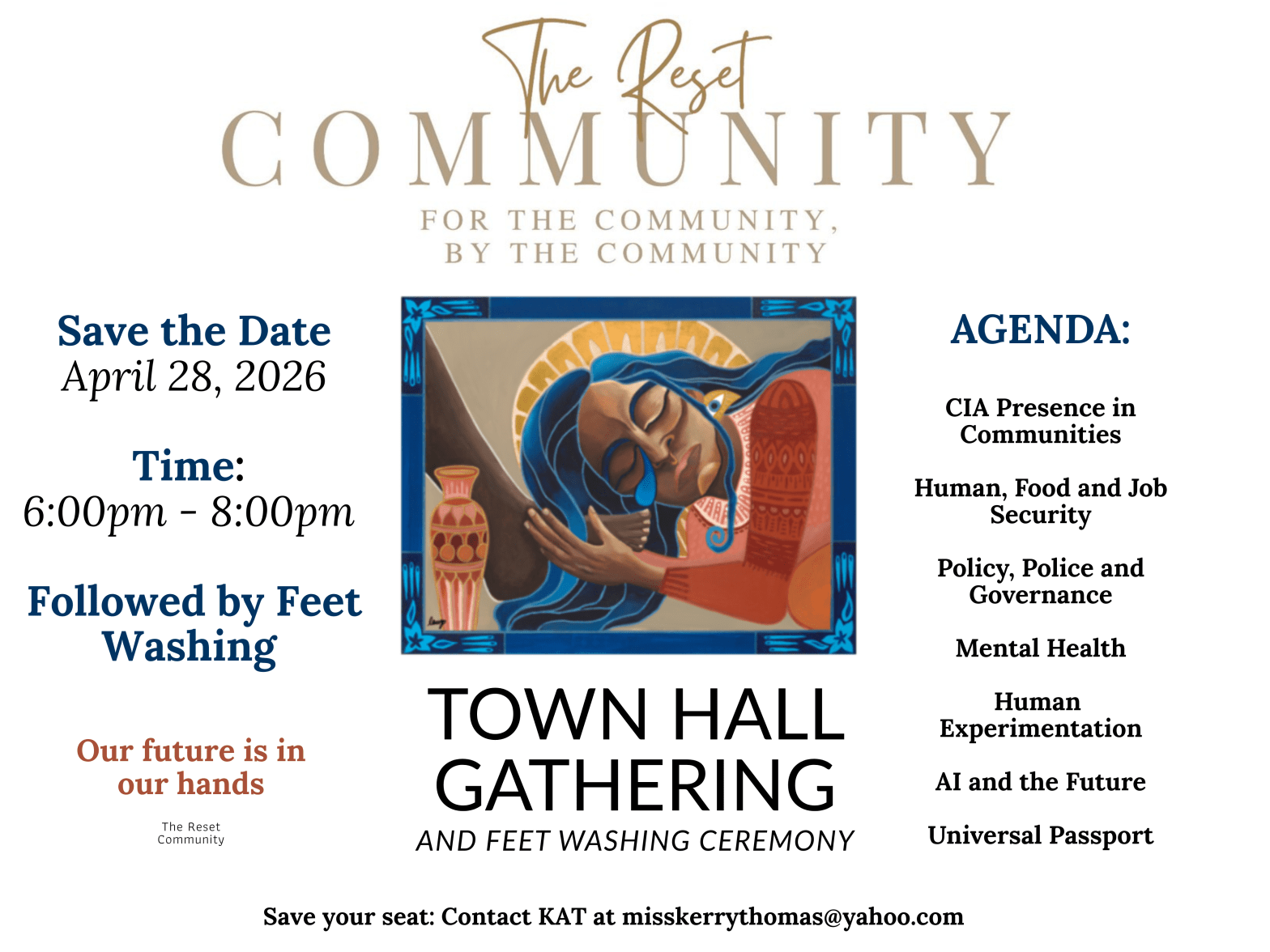TOWN HALL GATHERING AND FEET WASHING CEREMONY Posted byIT'S A CULTURE RESET!April 20, 2026April 20, 2026Posted inBlog, MediaTags:Canada, Ceremony, CIA, Community, Criminals, Government, Policy, Prison, Town Hall Share this:TweetLike Loading... Related Published by IT'S A CULTURE RESET! For the society, by society! View more posts